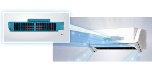 - Иновативен въздушен поток: Системата DUAL BLASTER с двойни странични вентилатори осигурява равномерно разпределение на въздуха, което гарантира комфортна температура във всяка точка на стаята.